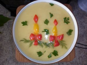 - Для светлой прослойки замачиваем 5 г желатина в 30 мл холодной воды. Прогреваем, растворяя гранулы, как и для приготовления бульона. Соединяем растворенную массу с майонезом, активно перемешивая соус. В рецепте используется домашний майонез на молоке.